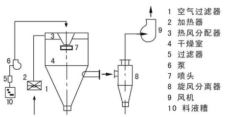 为使物料不受污染和延长设备寿命,凡与物料接触部分,均采用不锈钢材料制作。料液经喷雾后,雾化成分散的微粒,表面积大大增加,与热空气接触后在极短的时间内就能完成干燥过程。一般情况下在100~150℃,1~3s内就能蒸发95%~98%的水分。由于干燥过程是在瞬间完成的,产成品的颗粒基本上能保持与液滴近似的球状,从而具有良好的分散性、优良的冲调性和很高的溶解度。