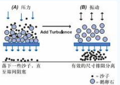 (A)对混合物施加直接的压力,使得底部砂粒落下;在筛网表面形成一个鹅卵石层,阻碍顶部砂粒向筛网方向移动并通过筛网。(B)振动筛网,破坏位于混合物底部的积聚鹅卵石层,使完全分离得以进行;切向流过滤中,进科流的错流动力学作用,就相当于此例中的振动。