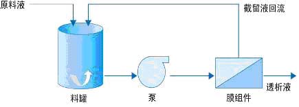 在过滤过程中料液通过泵的加压,料液以一定流速沿着滤膜的表面流过,大于膜截留分子量的物质分子不透过膜流回料罐,小于膜截留分子量的物质或分子透过膜,形成透析液。故膜系统都有两个出口,一是回流液(浓缩液)出口,另一是透析液出口。在单位时间(Hr)单位膜面积(m2)透析液流出的量(L)称为膜通量(LMH),即过滤速度。影响膜通量的因素有:温度、压力、固含量(TDS)、离子浓度、黏度等。