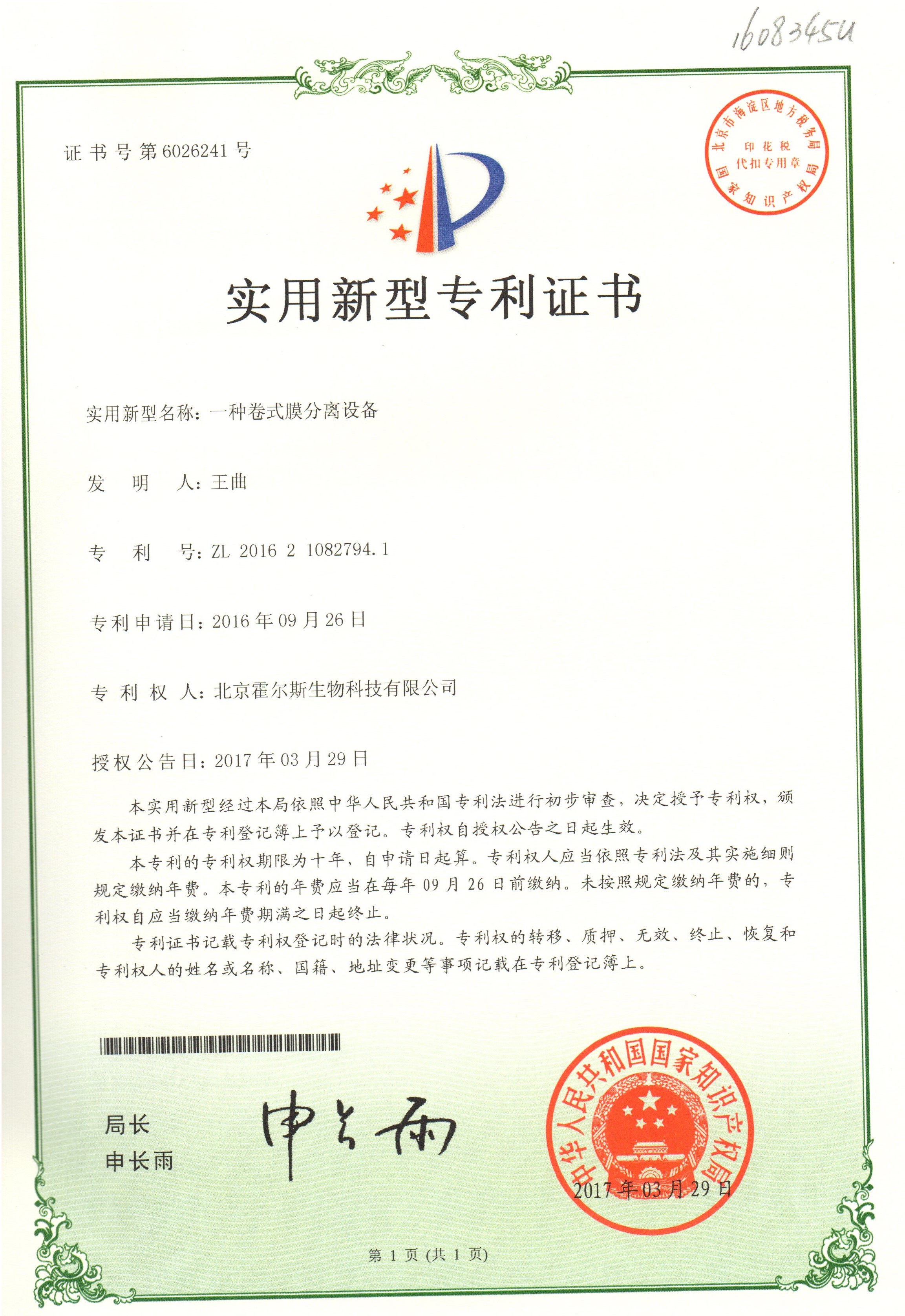350vip浦京集团获得膜分离设备的专利