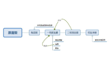 废酸经陶瓷膜过滤后回收偏钛酸,SS达到0.1ppm以下,产水进行一级脱盐(硫酸亚铁与废酸溶液分离),一级浓缩后的高盐废酸经过结晶(真空或者冷冻),大量的硫酸亚铁盐析出,可以副产净水絮凝剂(聚合硫酸铁),结晶母液返回一级纳滤膜继续脱盐。由于一级产水中仍然有部分亚铁盐,需要进行二级脱盐,二级产水中的亚铁含量可以达到50PPM以下,硫酸可以直接蒸发回用,二级浓缩液返回一级继续浓缩。此工艺基本达到工业废水“零”排放标准。