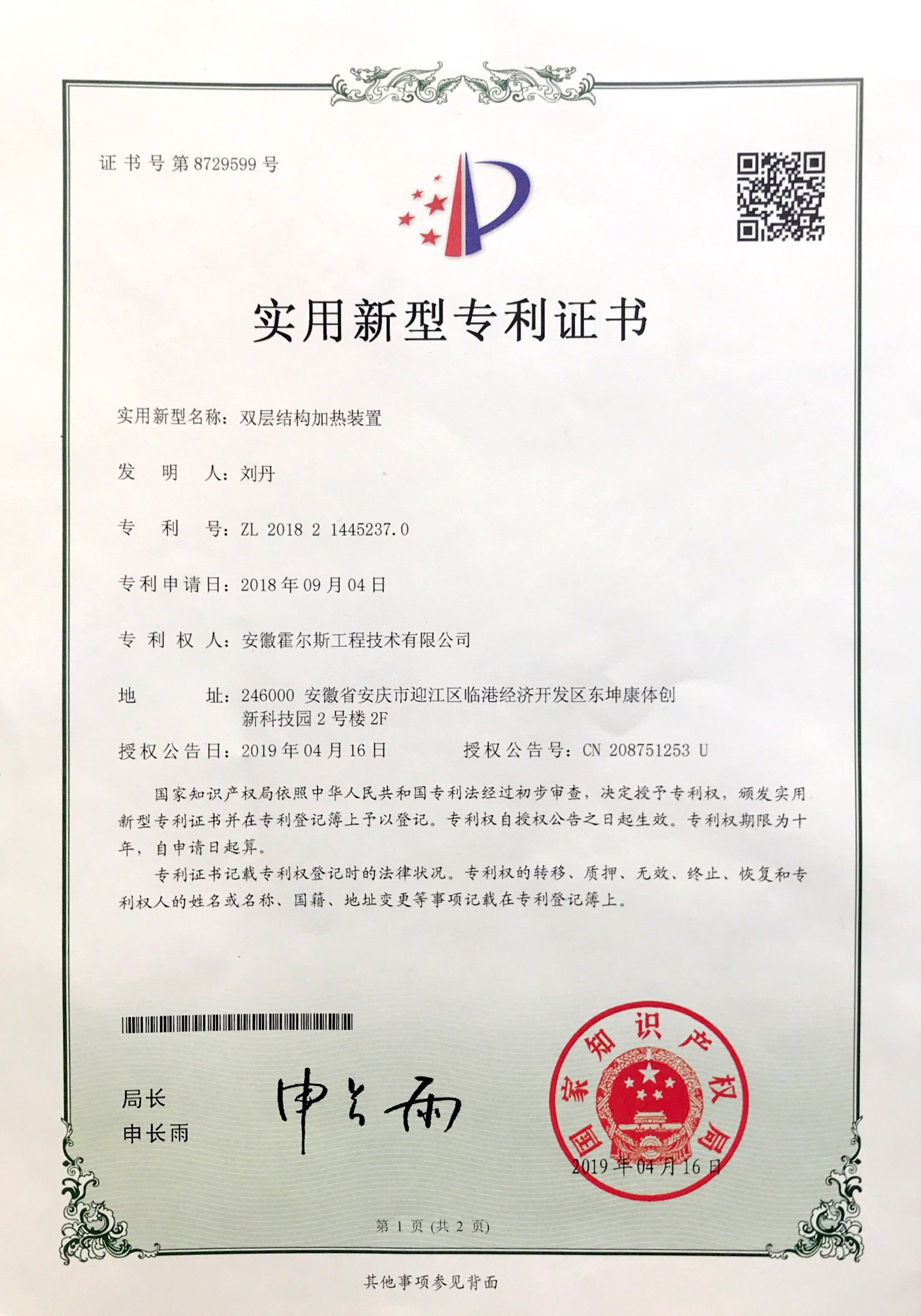 350vip浦京集团中试型喷雾干燥机双层结构加热装置荣获国家专利证书